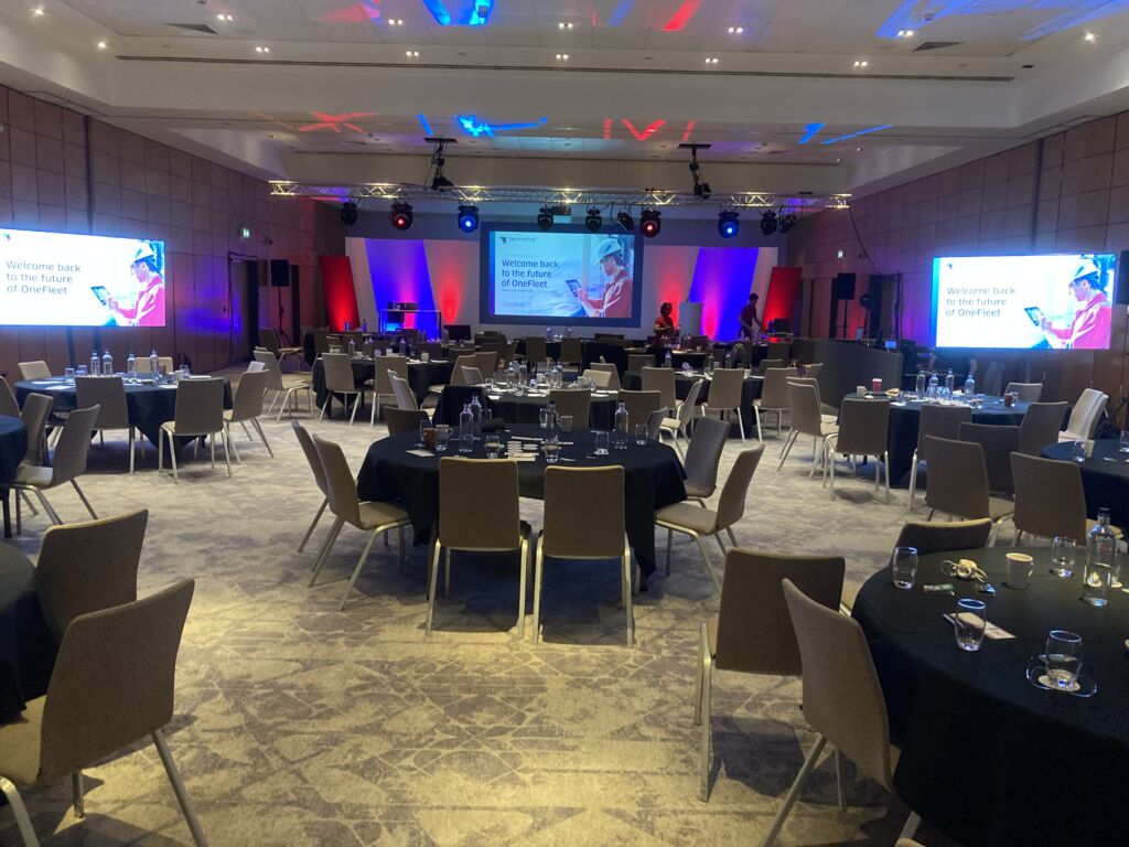 Bespoke Backdrop: Our team designed and constructed a unique backdrop using a blend of white leather grain and staging felt surfaces that perfectly echoed Technip’s corporate colours. This material choice provided a sophisticated texture that interacted beautifully with the lighting.